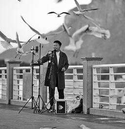 在昆明海埂大坝上,网络主播直播城市的美丽风光。新华社记者 王冠森摄