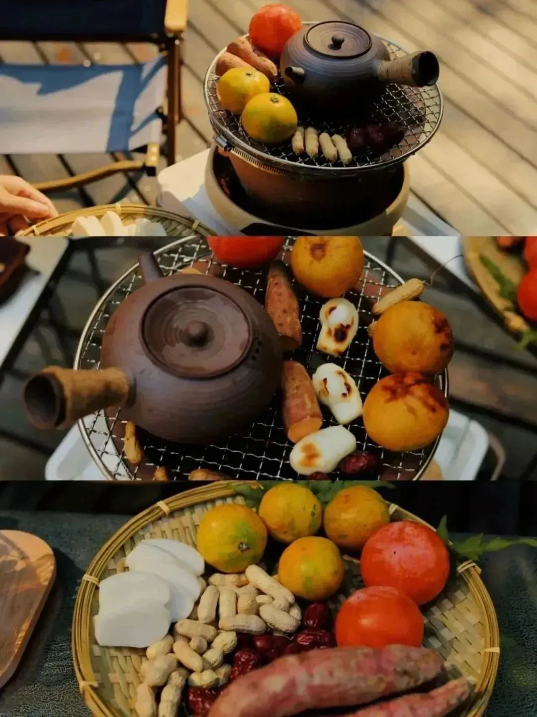 人们喜欢这种诗性与烟火气的结合。当茶炉在炉端咕嘟咕嘟的慢煮,散落四周的板栗、红薯、年糕,随着四溢的茶香逐渐软糯、微焦,围桌而坐的好友们在此刻一同获得温暖慰藉。