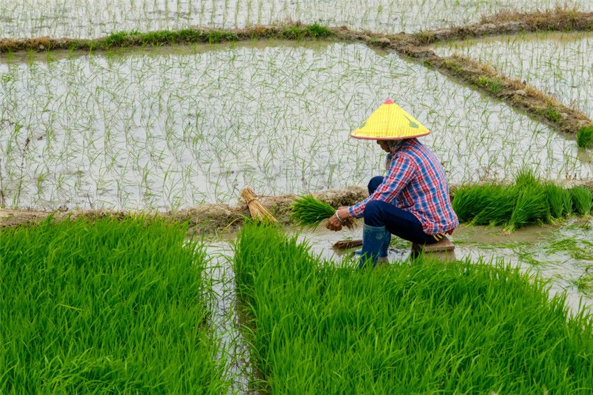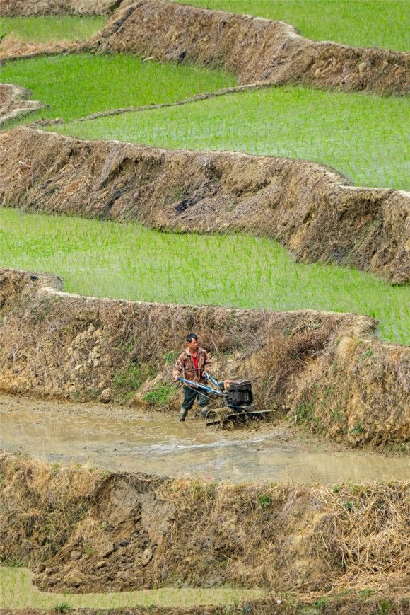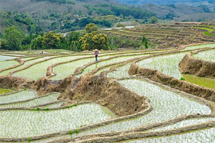 2023年2月15日,在海南省五指山市毛阳镇牙胡梯田,村民们在梯田里劳作,到处呈现出一幅幅春意盎然的美丽田园画卷。牙胡梯田位于海南中部山区,线条优美,错落有致,被誉为“海南第一梯田”。近年来,当地政府引导村民以“农户+合作社”的模式积极开展春耕生产,确保耕地面积、粮食播种面积、粮食产量“三不减”。