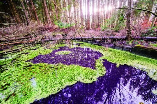 1月10日,德国下萨克森州希尔德斯海姆森林的一处池塘,池水变成了紫色。当地自然保护局的专家认为,紫色细菌可能是导致池水变色的主因。图片来源 视觉中国