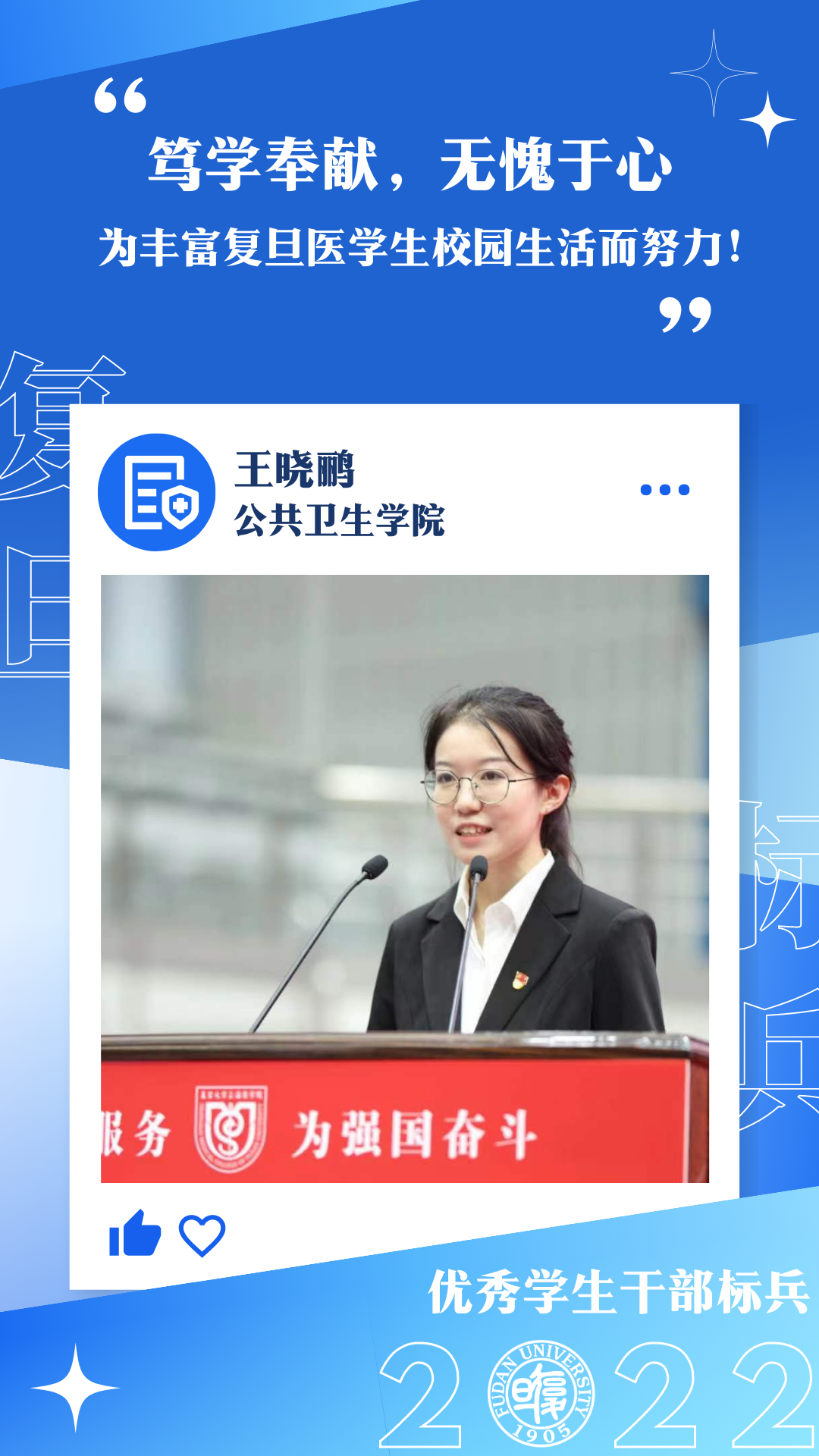 王晓鹂说:“公共卫生是一件面向人群的工作。作为学生骨干,要有和同学们一起面对困难的勇气和定力。我希望以我所学,让所有人一起努力,为人群的健康构建坚实有力的屏障。”