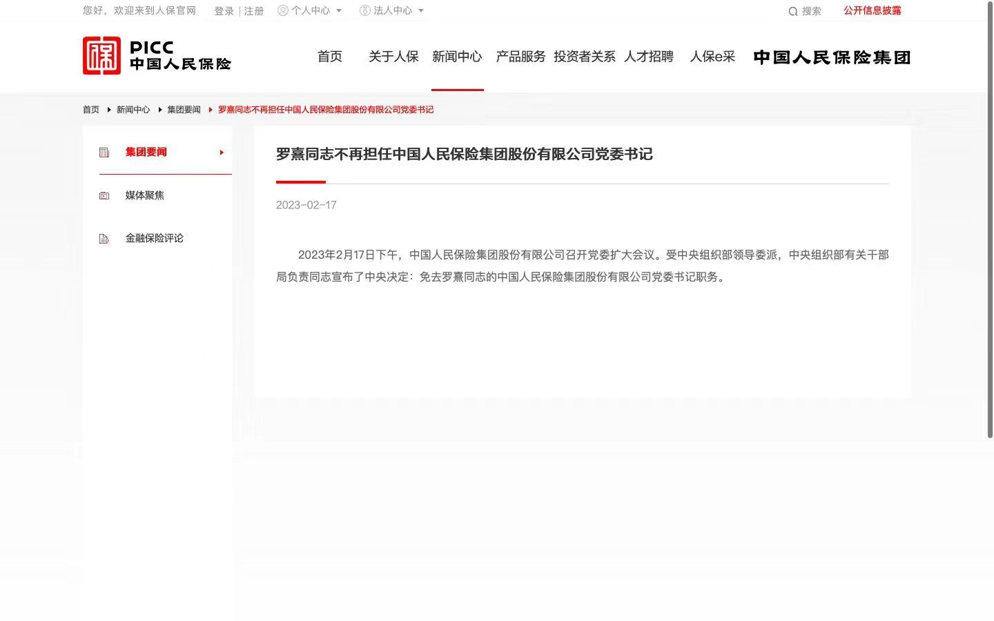 2月17日,中国人保集团官网发布消息,17日下午,中国人民保险集团股份有限公司召开党委扩大会议。受中央组织部领导委派,中央组织部有关干部局负责同志宣布了中央决定:免去罗熹同志的中国人民保险集团股份有限公司党委书记职务。
