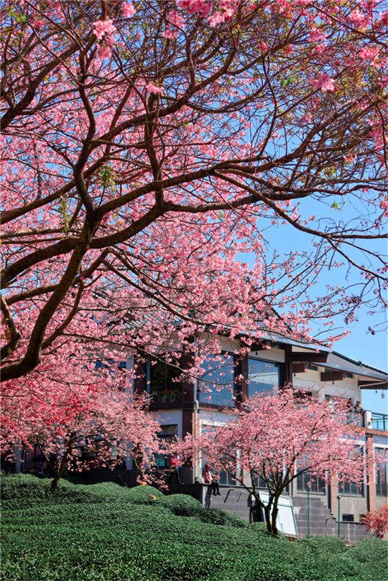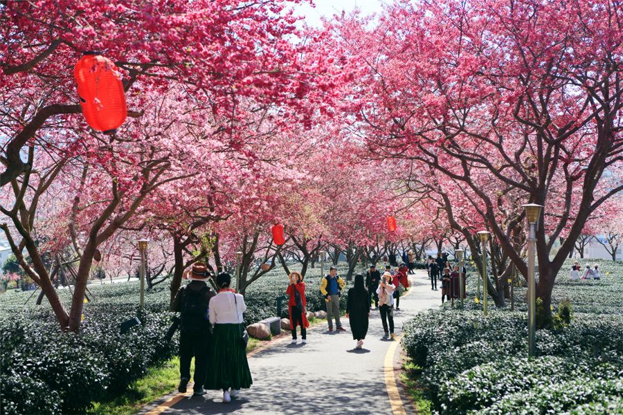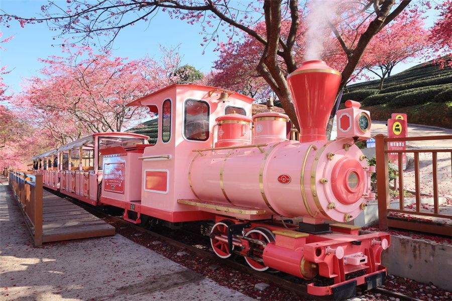 2023年2月16日,福建龙岩,永福樱花茶园,万株樱花盛开,樱花小火车缓缓穿行其间,众多游客前来赏樱。