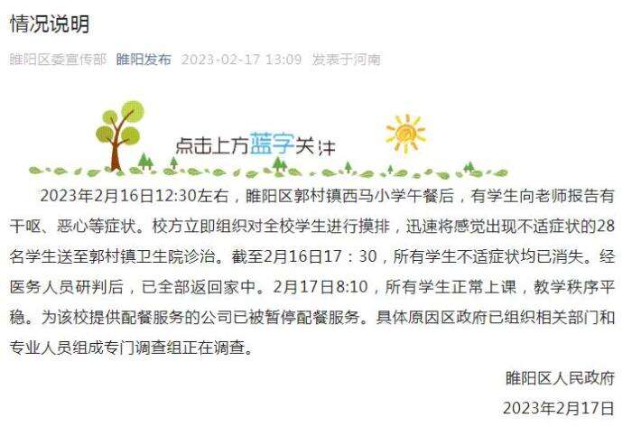 中新网2月17日电 据河南省商丘市睢阳区委员会办公室官方微信消息,2023年2月16日12:30左右,睢阳区郭村镇西马小学午餐后,有学生向老师报告有干呕、恶心等症状。校方立即组织对全校学生进行摸排,迅速将感觉出现不适症状的28名学生送至郭村镇卫生院诊治。