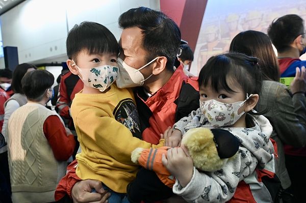 2023年2月17日深夜,香港特区救援队完成土耳其地震灾区搜救任务后返回香港,有救援队的家属在香港国际机场接机大堂等候。搜救队成员拥抱前来接机的孩子。 中新社记者 李志华 摄