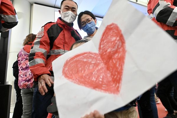 2023年2月17日深夜,香港特区救援队完成土耳其地震灾区搜救任务后返回香港,有救援队的家属等在香港国际机场接机大堂等候。孩子带上绘画的心形图案,前来迎接父亲。 中新社记者 李志华 摄