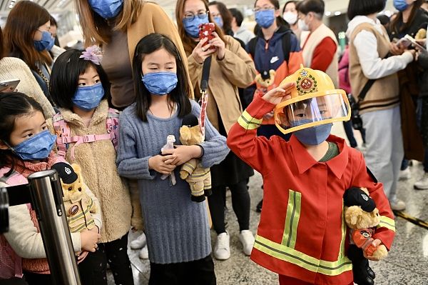 2023年2月17日深夜,香港特区救援队完成土耳其地震灾区搜救任务后返回香港,有救援队的家属等在香港国际机场接机大堂等候。儿童穿上消防员服饰前来迎接救援队返港。 中新社记者 李志华 摄