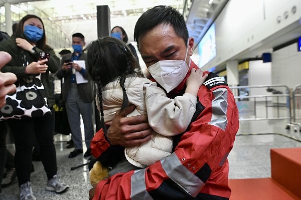 2023年2月17日深夜,香港特区救援队完成土耳其地震灾区搜救任务后返回香港,有救援队的家属等在香港国际机场接机大堂等候。搜救队成员拥抱前来接机的女儿,期间感动落泪。 中新社记者 李志华 摄