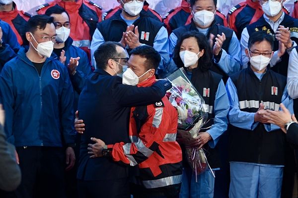 2023年2月17日深夜,香港特区救援队完成土耳其地震灾区搜救任务后返港。18日凌晨,特区政府在香港国际机场为队员举行迎接仪式。土耳其驻港总领事拥抱救援队队员感谢他们为土耳其救灾工作的付出。 中新社记者 李志华 摄