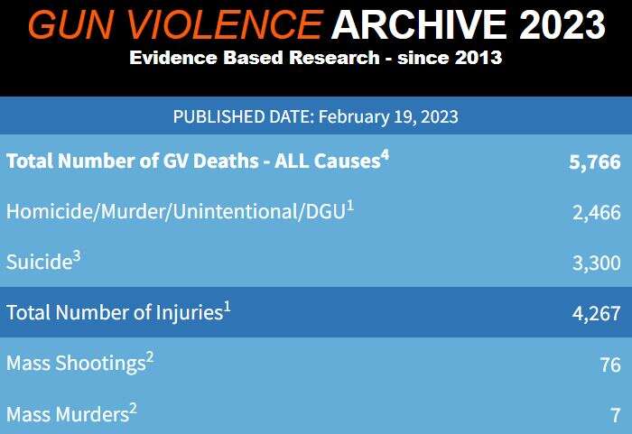 根据美国“枪支暴力档案”网站的最新统计,截至当地时间2月19日,美国今年已有5766人死于枪支暴力(包括自杀)。