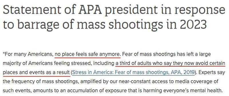 根据美国心理协会的专项研究,如今有三分之一的美国民众无论去哪儿,都担心自己成为大规模枪击事件的受害者;近四分之一的民众承认,自己为躲避大规模枪击事件而改变了生活方式。