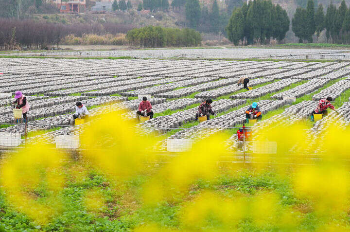 2月19日,湖南省永州市新田县中山街道黄沙溪村木耳种植示范基地,村民在采收木耳。新华社发(刘贵雄 摄)