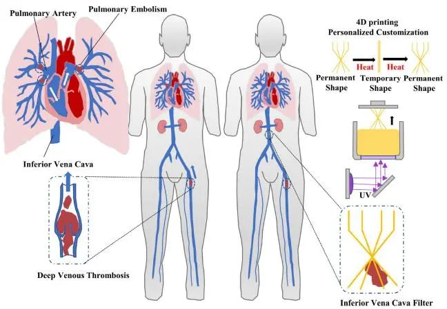 4D打印形状记忆IVCF微创治疗PE的设计示意图