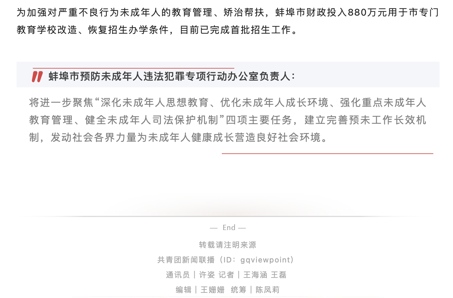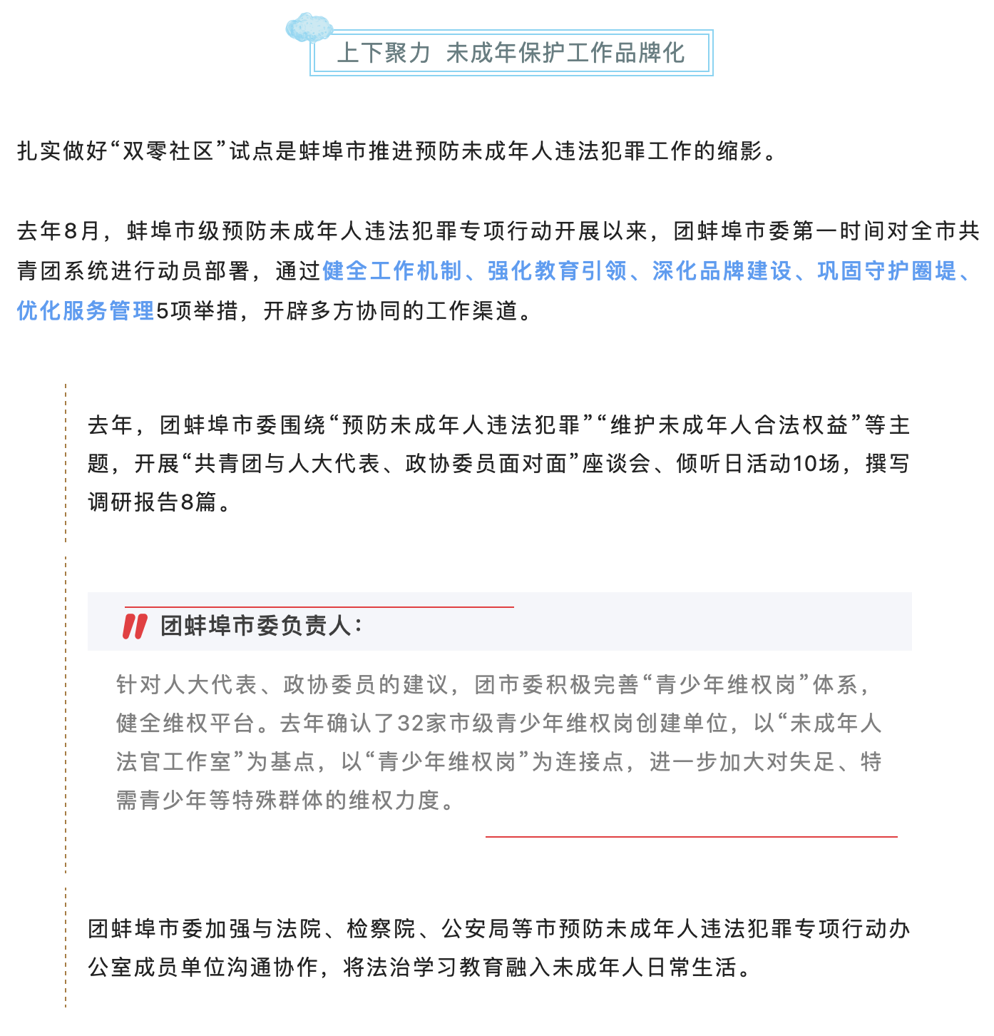 团安徽省蚌埠市委通过健全工作机制、强化教育引领、深化品牌建设、巩固守护圈堤、优化服务管理5项举措,聚力守护未成年人。