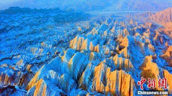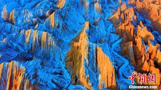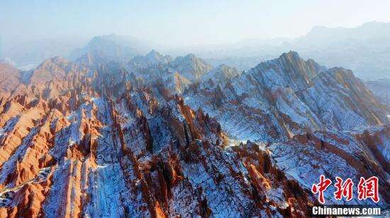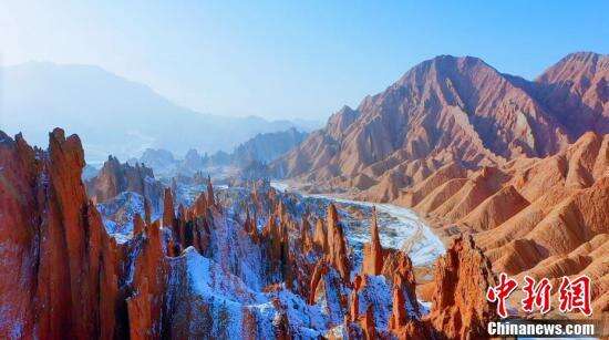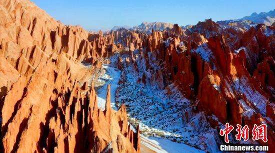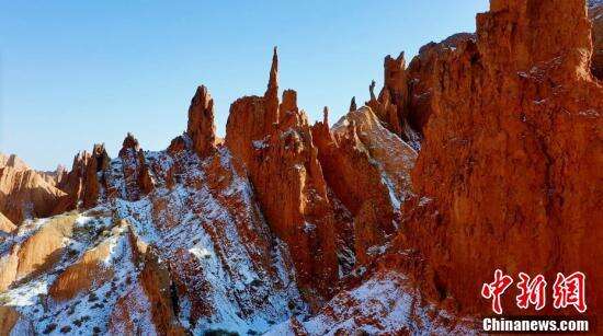 远看石林层层叠叠,错落有致,交相辉映,奇峰突起,耸立在天山南麓,中间点缀薄薄积雪为山体披上了一层薄纱,别有一番趣味。图为红色山体层峦叠嶂,点点白雪点缀其中。郭建将 摄