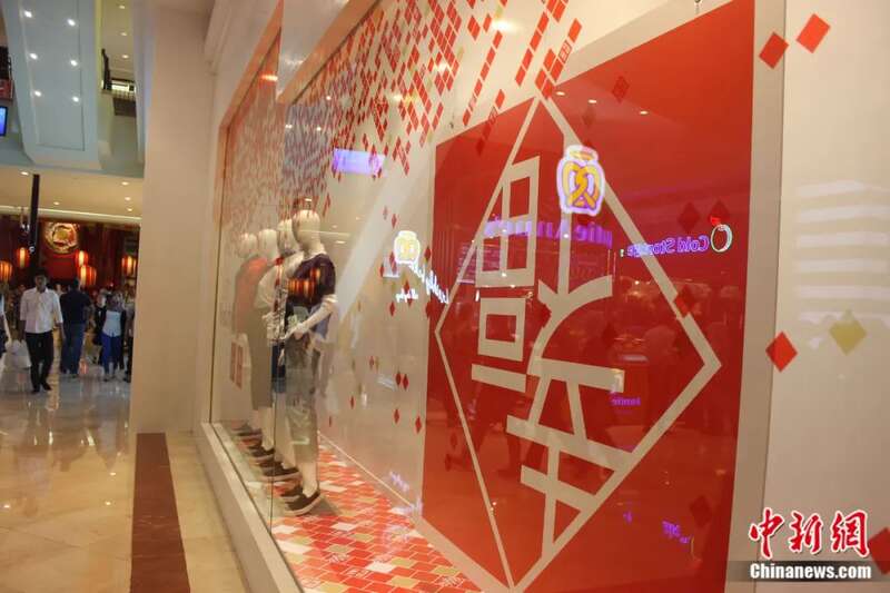 中国农历春节期间,马来西亚吉隆坡标志建筑双子塔内的商场橱窗展示了以“福”字为主题的陈设。赵胜玉 摄