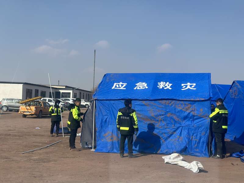 事故现场救援人员正在搭建帐篷。中青报·中青网记者 石佳/摄