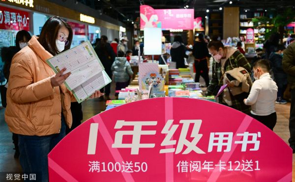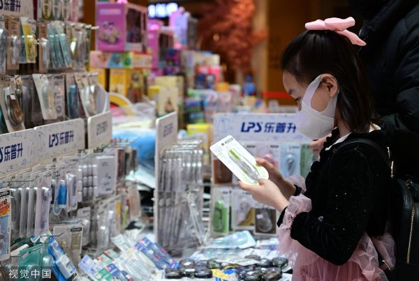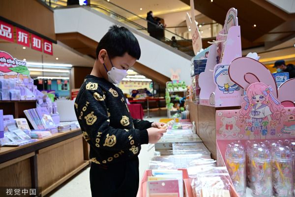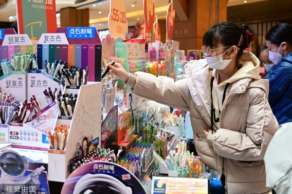 2023年2月23日,辽宁沈阳,学生在选购学习物品。开学季即将到来,不少家长带着孩子来到商店为新学期添置学习用品等“新装备”。中新社记者 于海洋 摄