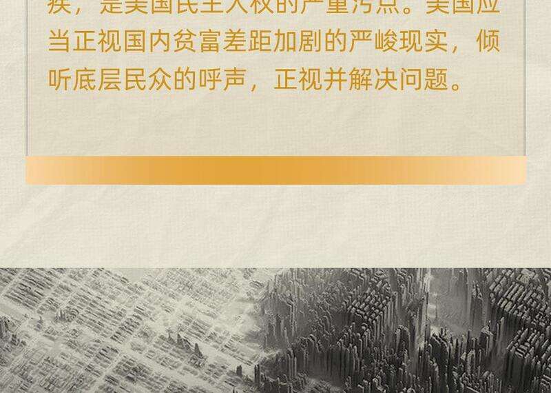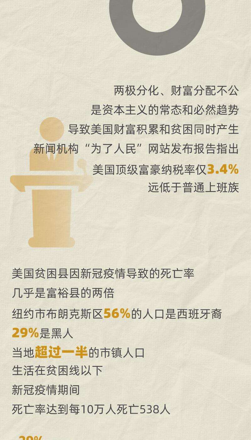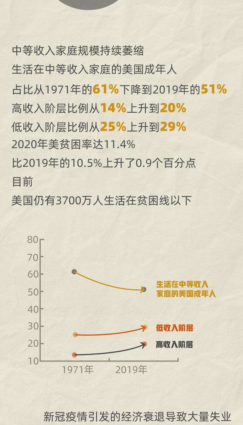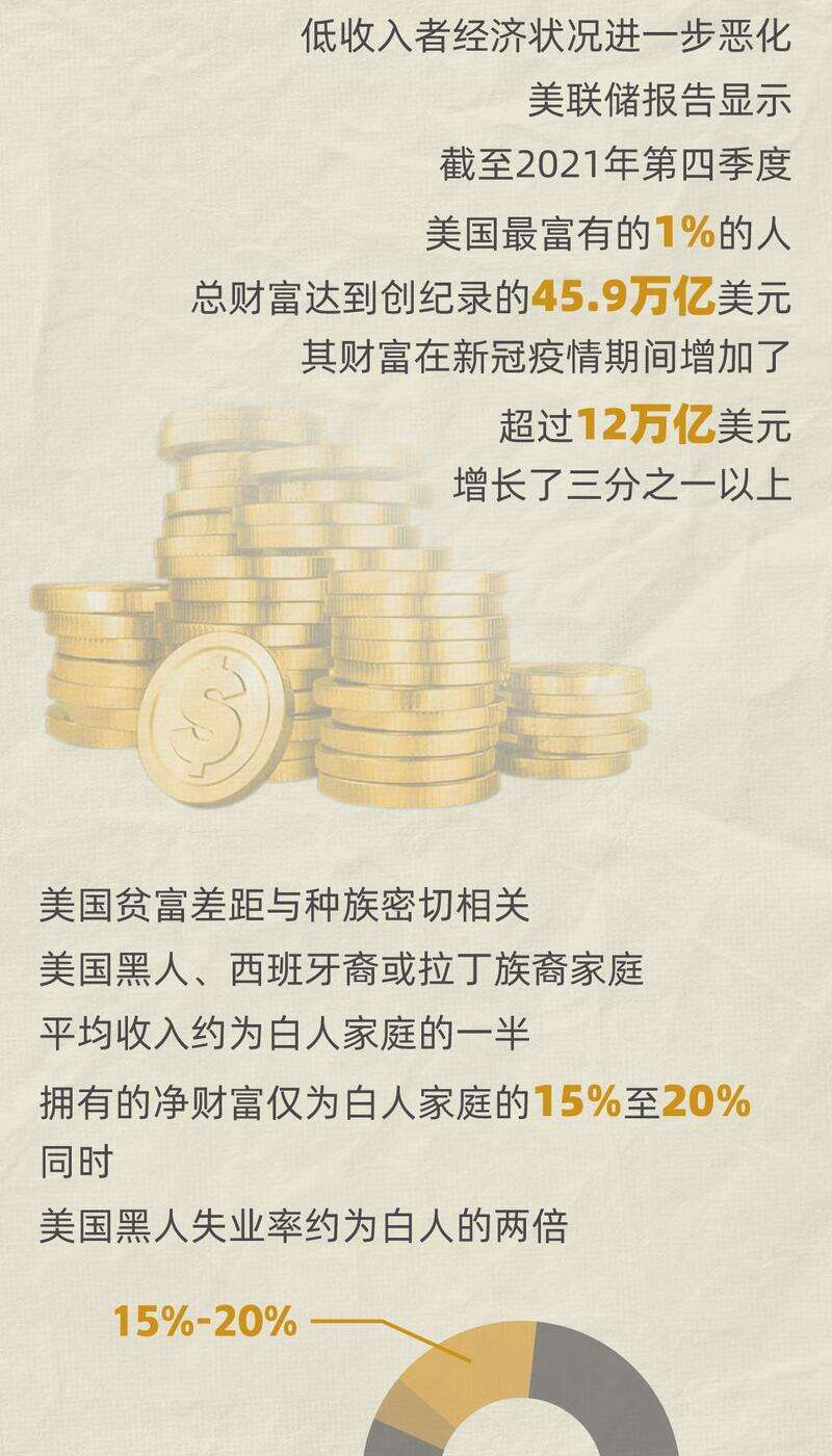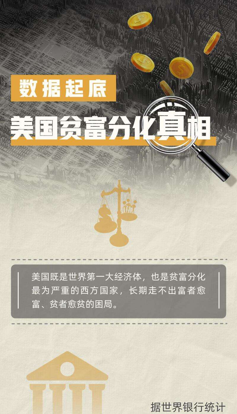 《美国贫富分化持续恶化的事实真相》报告今天(23日)发布。报告指出,在世界各地消除一切形式的贫困是联合国可持续发展的重要目标。发展的根本目的是为了人民的共同富裕,应当成为各国的共识与行动。美国作为头号资本主义国家,光鲜的面纱遮掩不住贫富分化的冷酷现实。美国贫富分化已成为社会痼疾,是美国民主人权的严重污点。一图数据起底,美国贫富分化真相。