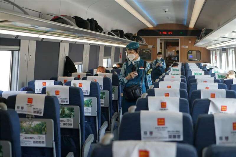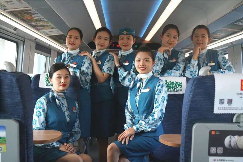除了列车广播,值乘中老铁路国内段复兴号动车组列车的乘务员,也可以在旅途中提供多语言服务。