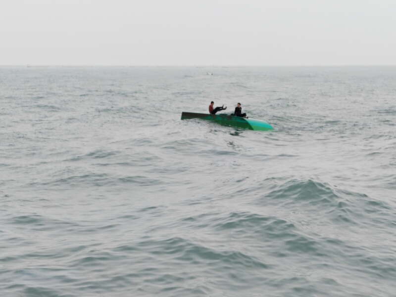 当日12时10分,防城港市海上搜救中心接警,在核电站取水口附近海域一艘渔船发生倾覆,翻扣在海面,船上2人坐在翻扣渔船船底上,随时面临被海浪拍入海中的危险。