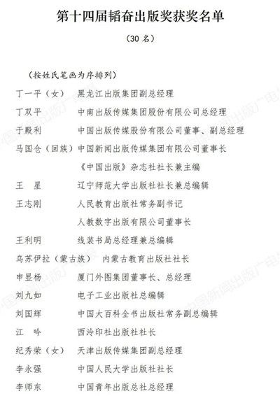 根据中央宣传部文件批复精神,由中国出版协会主办、韬奋基金会协办第十四届韬奋出版奖。评委会秉承科学、严谨、公平、公正、质量第一的原则,经过初评、复评、终评,已于2023年2月22日评选揭晓,30位长期勤奋工作在出版一线,身体力行韬奋精神,在出版工作中作出突出贡献的优秀出版工作者获此殊荣。现将获奖名单公示如下,自见报之日起7日内,如认为获奖者有重大问题,请列举具体事实,并署实名、联系方式,向韬奋出版奖评委会办公室书面反映。