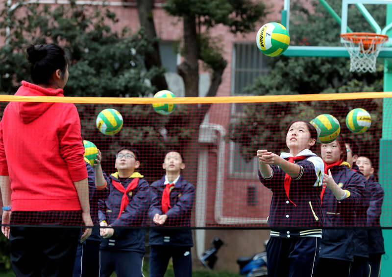 2020年12月11日,上海格致初中的体育专项课以“走班”方式进行,图为八年级的学生在上排球专项课。 新华社记者 刘颖 摄