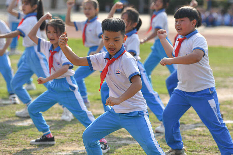 2月13日,海南省屯昌县新兴中心小学,学生在演练武术。新华社记者 蒲晓旭 摄