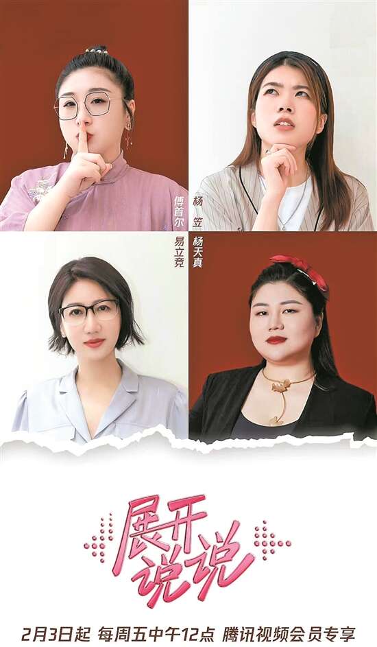 经历了改档延播的《展开说说》,在第二次“启航”时依然获得关注。四人主持团堪称内娱女“名嘴”圈层的“天花板”,自带流量:杨天真是知名经纪人,最近几年,她从幕后走到台前,频繁参加综艺节目,观点输出能力不俗;杨笠是知名脱口秀演员,曾因一句“为什么男人看起来明明那么普通,但是却可以那么自信”走红全网;易立竞是知名人物访谈记者,人称“娱乐圈照妖镜”,曾因训话审判式提问,让众多娱乐明星禁不住真情流露;傅首尔是《奇葩说》第七季总决赛冠军,在辩论中,儿子、老公永远能进入她的素材库,各种包袱信手拈来。在阵容公布时,不少网友表示想看她们对嘉宾刨根问底,“刨得干干净净”。