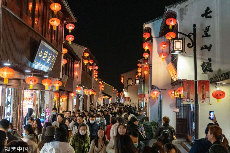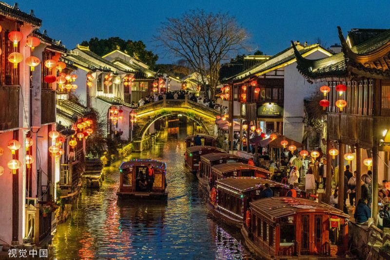 2023年2月27日晚,苏州市姑苏区,七里山塘景区夜景优美、游人如织。