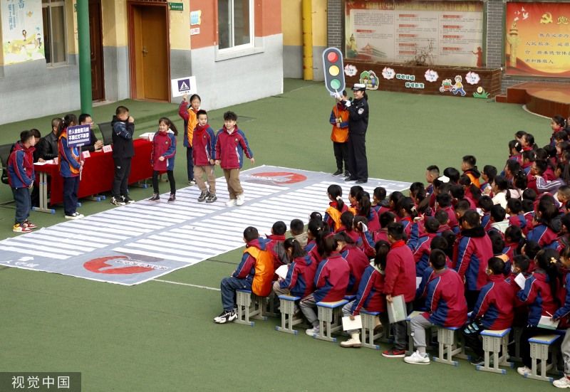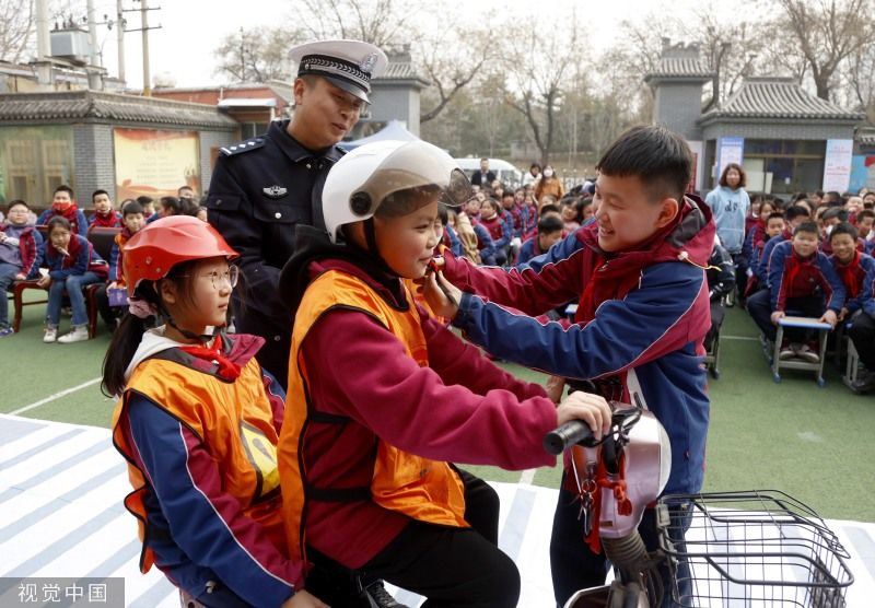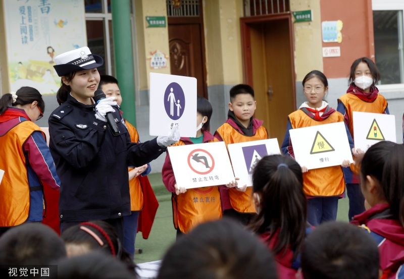 2023年2月27日,陕西省渭南市公安局交警支队临渭大队民警让小学生从游戏互动中学习交通安全知识。