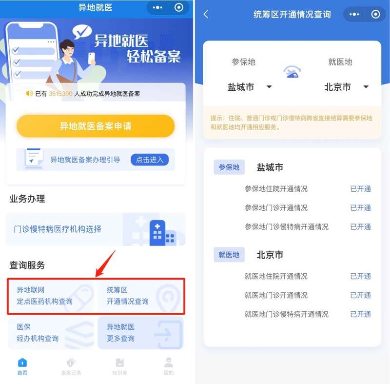除了申请备案外,参保人还可以在小程序查询各统筹区及异地联网定点医药机构的开通情况。