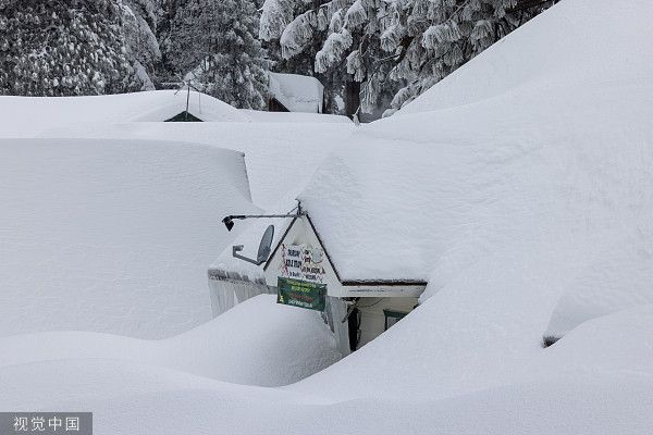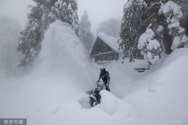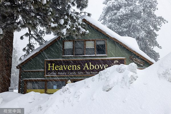 当地时间2023年3月1日,美国加州,圣贝纳迪诺山区的一座教堂被埋在雪下,居民继续被困在那里。圣贝纳迪诺县宣布进入紧急状态,因为一系列暴风雪关闭了通往山区的所有道路,导致该地区的汽油、食品和物资短缺,许多社区仍被埋在地下。