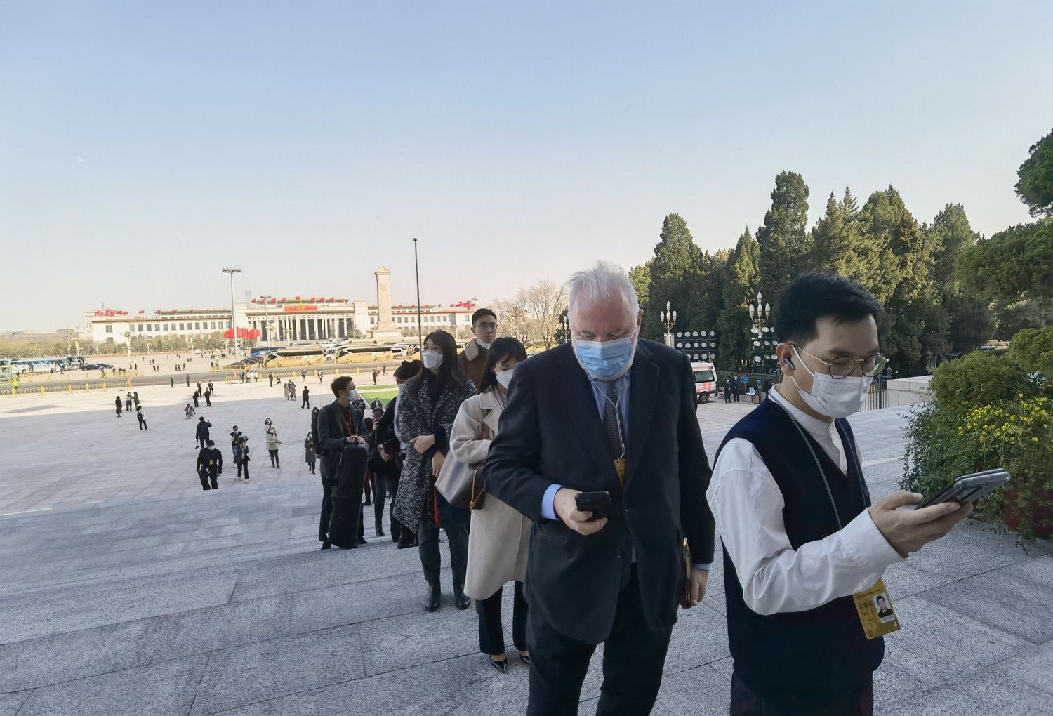 中外记者在人民大会堂外排队等候入场。中青报·中青网记者 耿学清/摄
