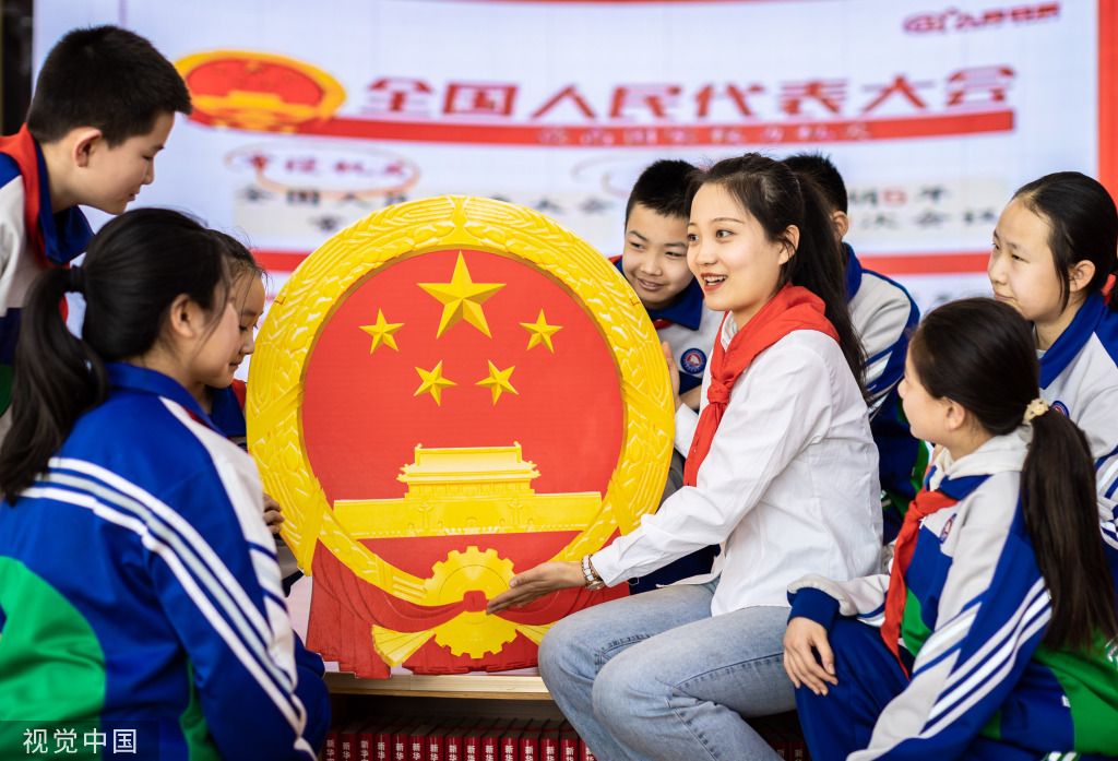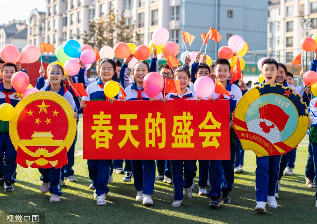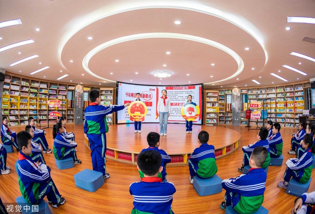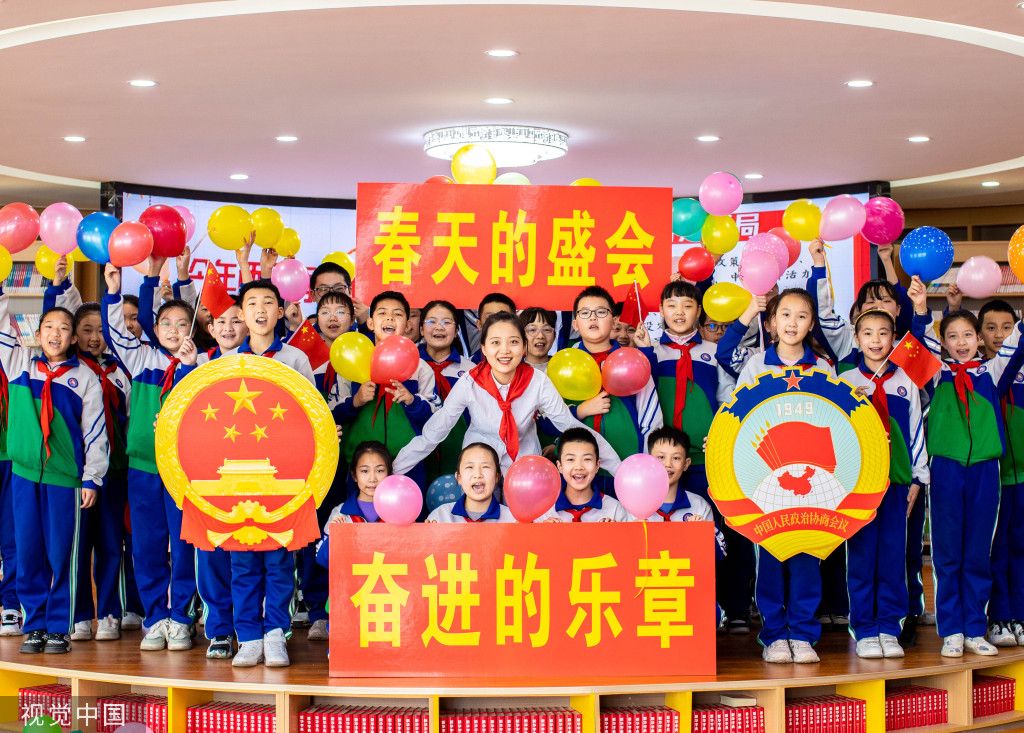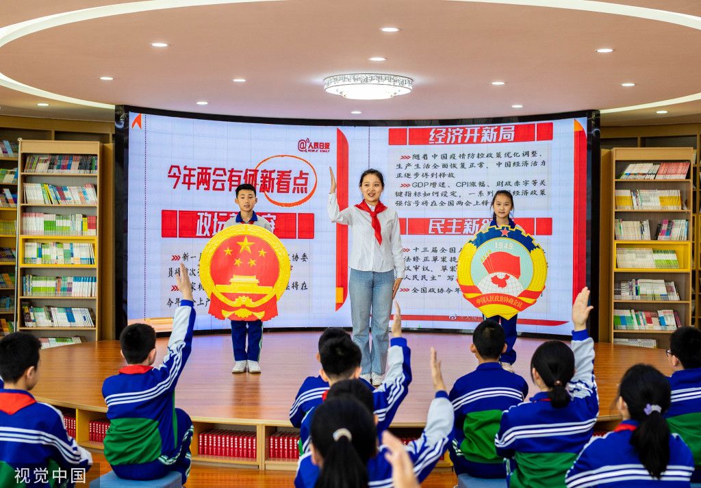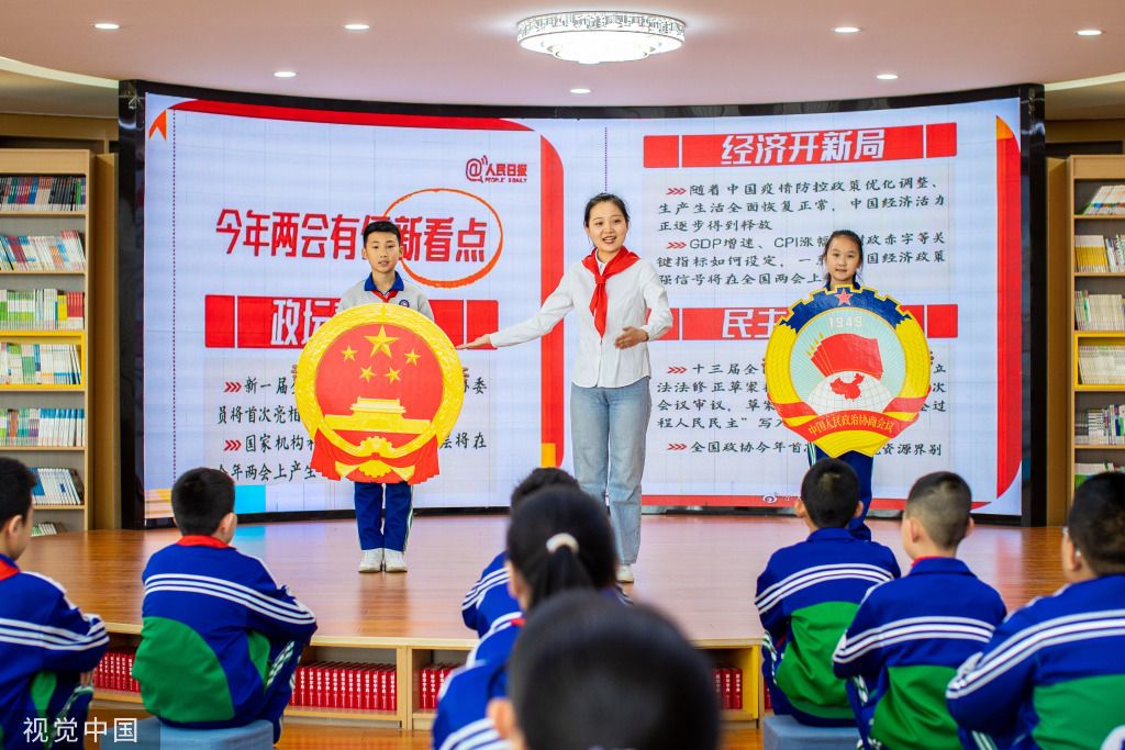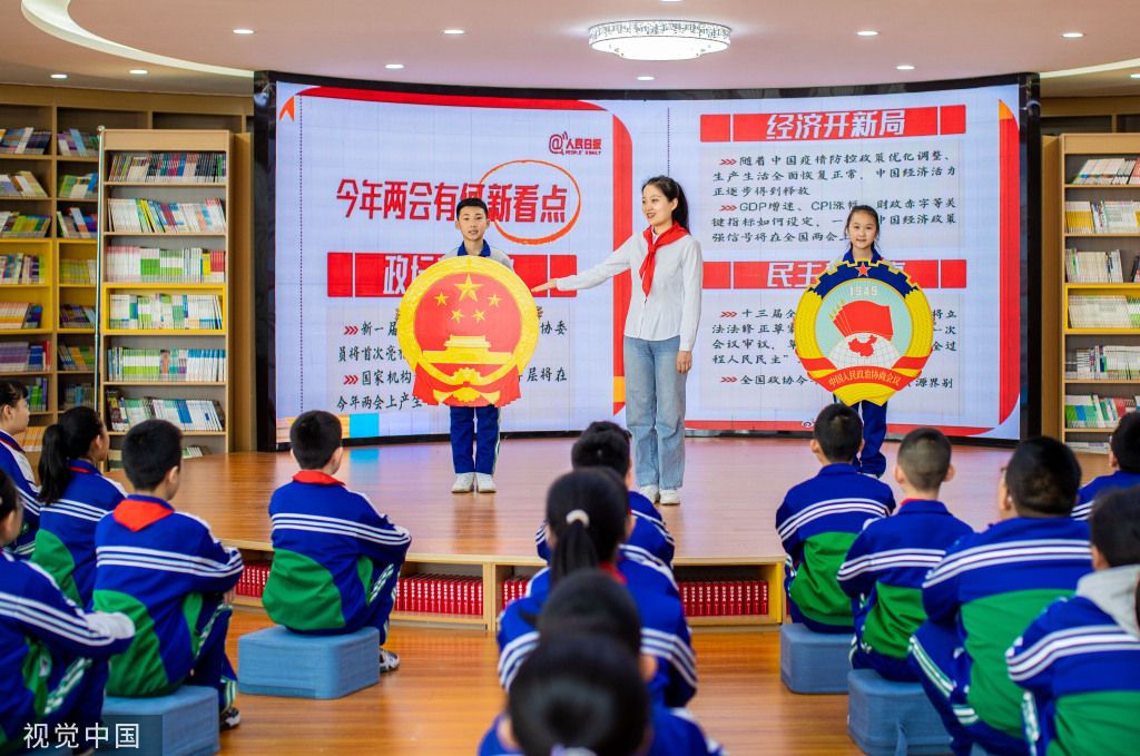 2023年3月3日,呼和浩特,全国两会即将召开,玉泉区通顺街小学开展“两会知识进课堂”活动,向学生普及两会知识,引导学生从小关心、关注国家大事。