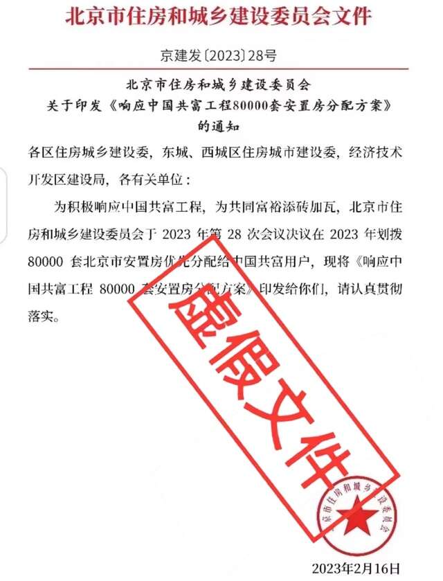3月3日,北京市住建委官方微信发布澄清消息称,网传“响应中国共富工程80000套安置房分配方案”系虚假文件。