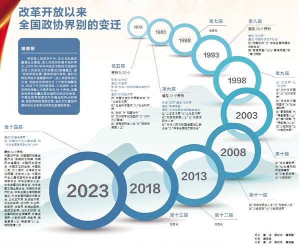 界别是人民政协产生、存在与发展的重要社会基础,是人民政协的基本组织单元。2019年《中共中央关于新时代加强和改进人民政协工作的意见》明确提出,要“优化界别设置,增强界别代表性,更好反映各界各方面愿望诉求”。自人民政协成立以来,全国政协界别经历了不断地调整优化,形成了今天包括党派、人民团体、社会各界和特邀人士等多类共34个界别。沿着政协界别设置及其发展变化的历史脉络,不难发现界别演变中所蕴含的特点和规律。梳理界别的演变过程,我们也可以看到中国经济社会的变迁和民主发展的进程。