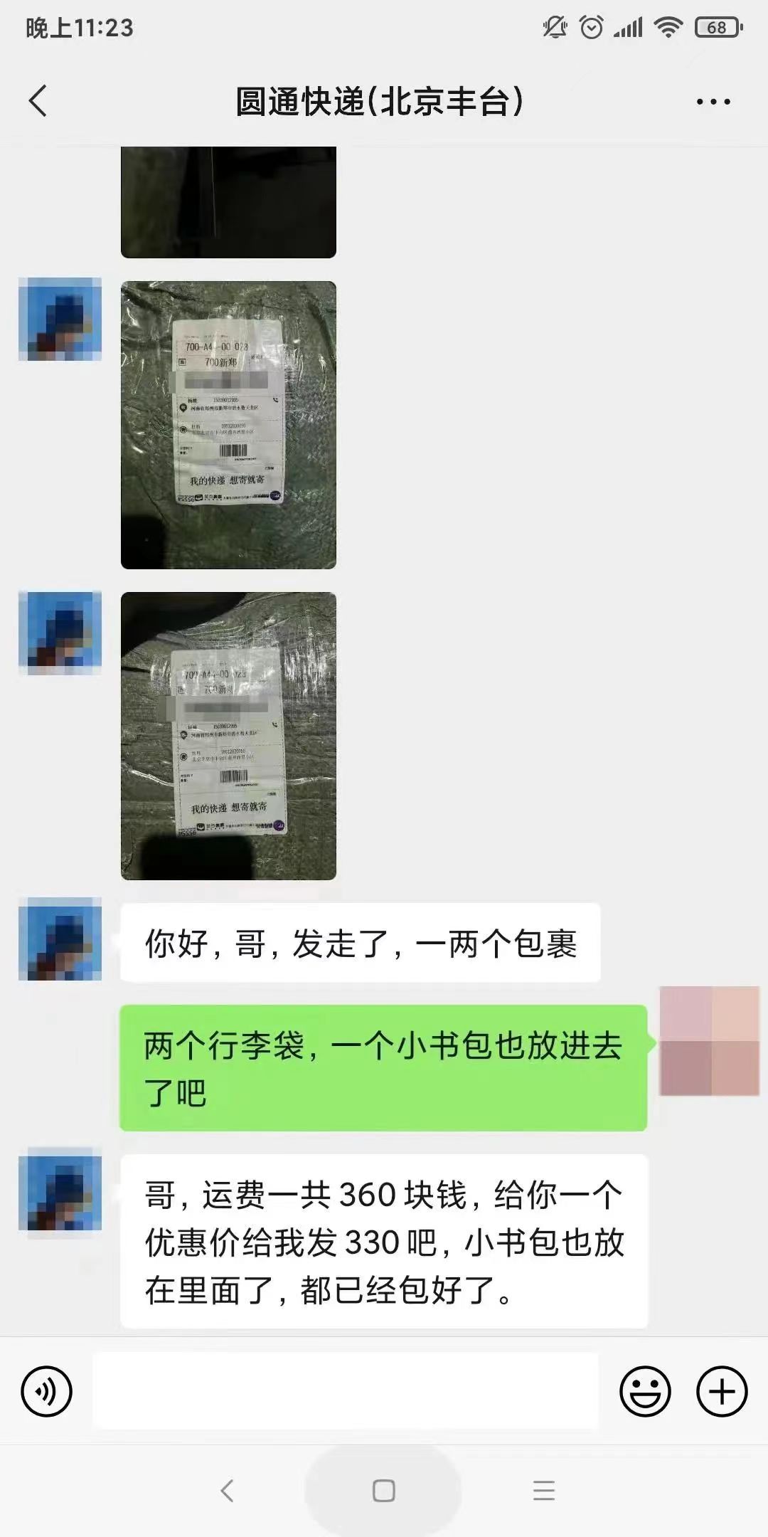 杜先生提供的聊天记录显示,快递员将包裹拉回快递点后,通过微信向他发送了包裹的订单信息和称重图片。图片显示两个包裹共计45.26公斤。快递员表示此单快递每公斤8元,优惠30元,收费330元。