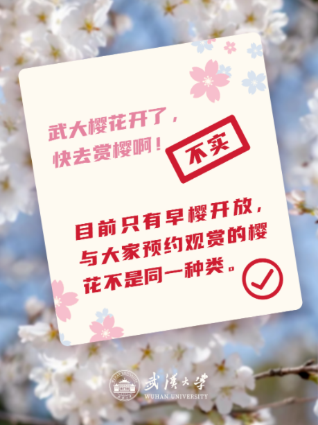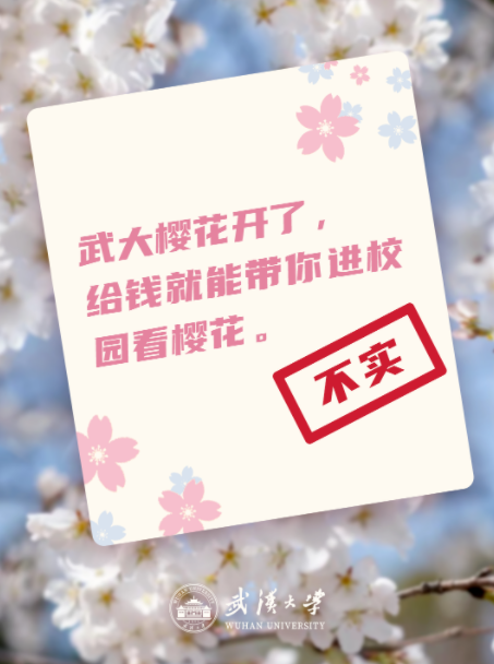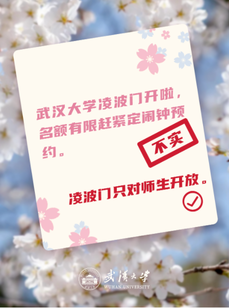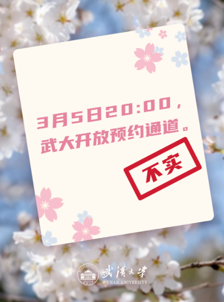 3月5日晚,武汉大学官方账号就网上流传的“武大赏樱消息”回应,发现部分社交平台有不实消息,以下这些,请大家注意: