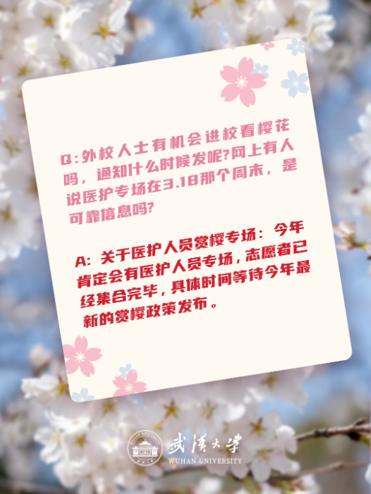 另外,还有留言询问医护赏樱专场开放时间,武汉大学方面回复称,今年一定会有医护赏樱专场,相关志愿者已全部集结完毕,具体开放时间需待官方赏樱政策发布。