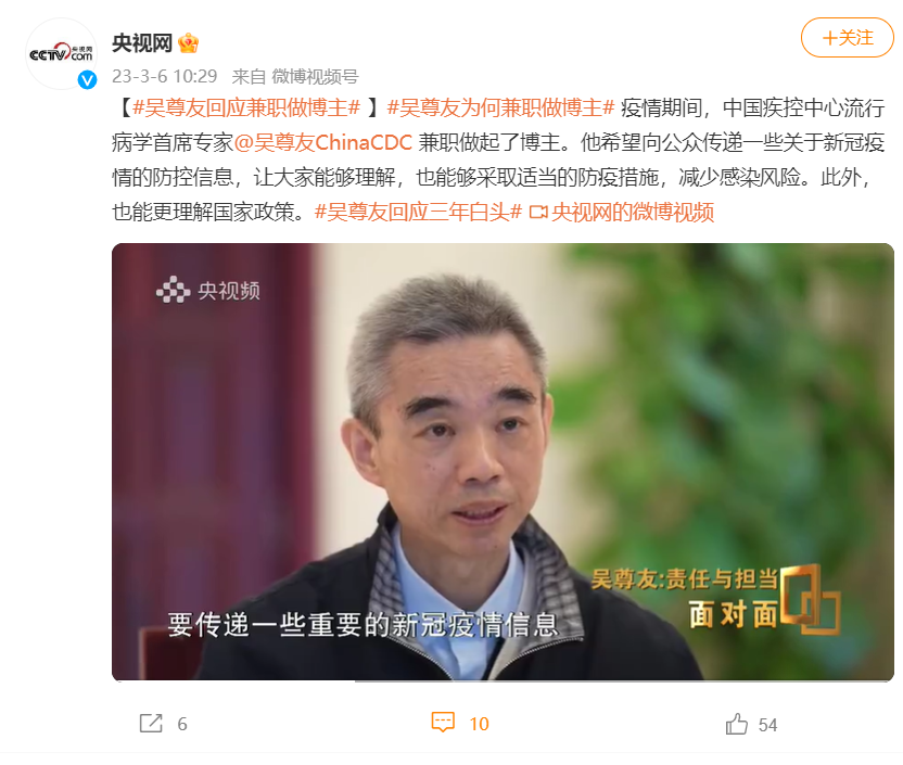 疫情期间,吴尊友兼职做起了博主。他希望向公众传递一些关于新冠疫情的防控信息,让大家能够理解,也能够采取适当的防疫措施,减少感染风险。此外,也能更理解国家政策。