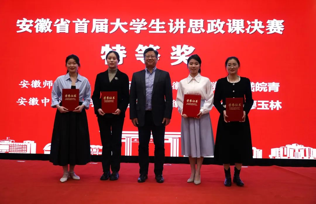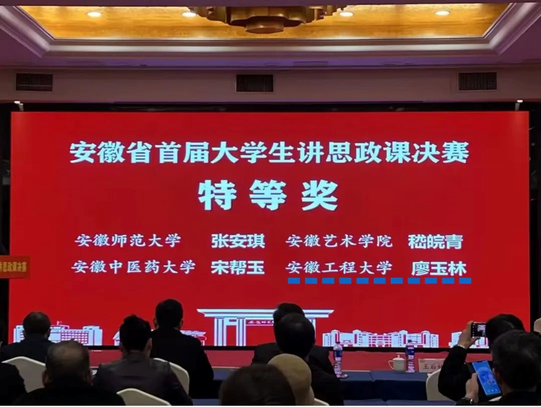 “3月4日,安徽省首届“大学生讲思政课”决赛在安徽芜湖隆重举行。经过激烈角逐,安徽工程大学马克思主义学院研究生廖玉林团队勇夺决赛特等奖,该奖项全省仅设置4项,系安徽工程大学马克思主义理论学科赛事中取得的突破性成绩。该团队指导教师徐东辉荣膺优秀指导教师。”