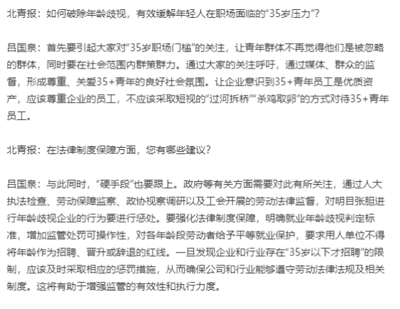 全国政协委员吕国泉提交有关打破35岁“职场天花板”的提案,他建议,一旦发现企业和行业存在“35岁以下才招聘”的限制,应该及时采取相应的惩罚措施,从而确保公司和行业能够遵守劳动法律法规及相关制度。这将有助于增强监管的有效性和执行力度。