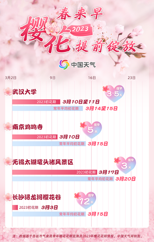 由于气温偏高,今年武汉、南京、无锡和长沙等地赏樱胜地的花期都比常年平均日期偏早,其中长沙浔龙河樱花谷景区初花期比常年平均日期提早了12天。