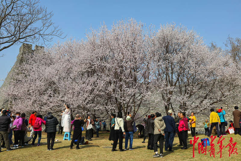 3月10日,北京北京明城墙遗址公园,人们在繁花盛开的树下观赏、拍照。中青报·中青网记者 李建泉/摄