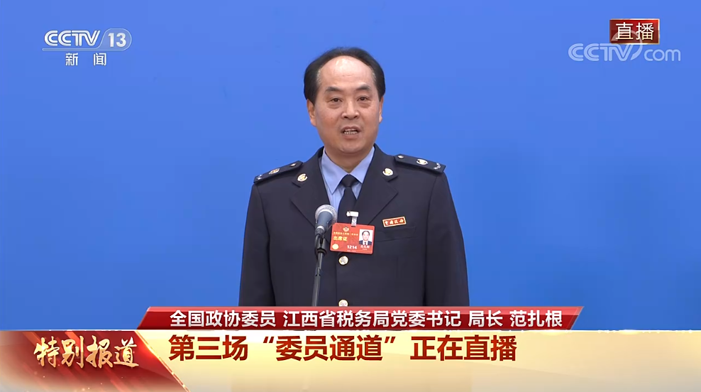 今天下午,全国政协十四届一次会议第三场“委员通道”在人民大会堂举行。全国政协委员、国家税务总局江西省税务局党委书记范扎根谈税收的“取”与“用”。(图源:央视网)