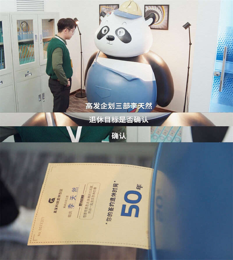 笔者最喜欢的一集,是退休协议机。在延迟退休的大环境下,公司出现了一台只要你提出自己的退休计划,就能帮你测算出何时退休的熊猫机器,前提是要从当下就开始卷。最终,大家放弃了签订退休计划,选择活在当下,珍惜眼前的每一个日落。