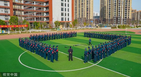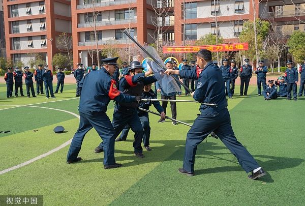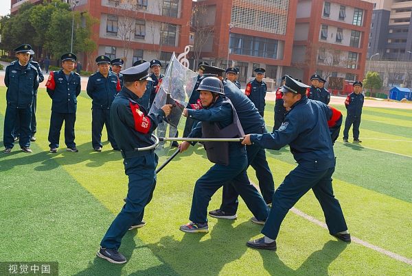 2023年3月12日,安徽合肥,在行知学校站塘校区,校园保安正在进行防暴演练。当日,合肥市瑶海区举行校园专职保安员岗位技能培训,对全区230多名校园保安进行防护器械使用、突发事件应急处置和自护自救常识等方面的实战操练,有效提升保安人员的快速反应能力和综合处置水平。