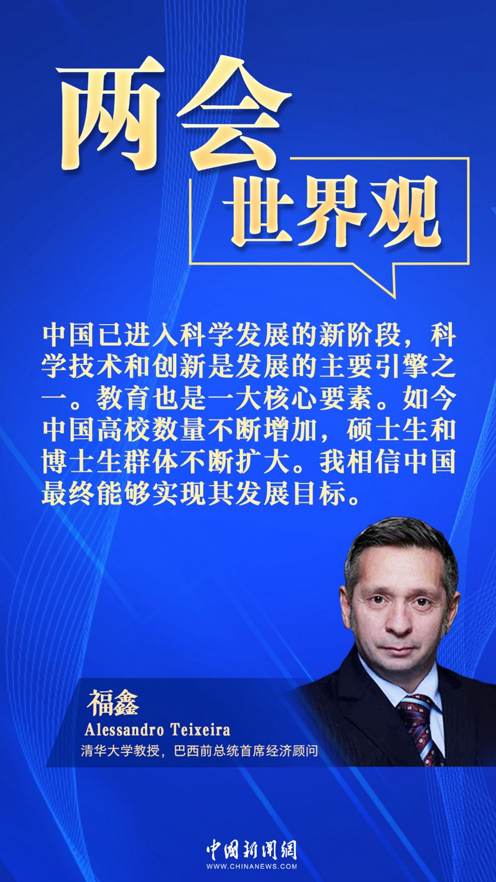 当今中国已进入科学发展的新阶段,科学技术和创新是发展的主要引擎之一。教育也是一大核心要素。福鑫教授注意到,中国高等教育取得了长足进步,他对中国最终实现其发展目标充满信心。