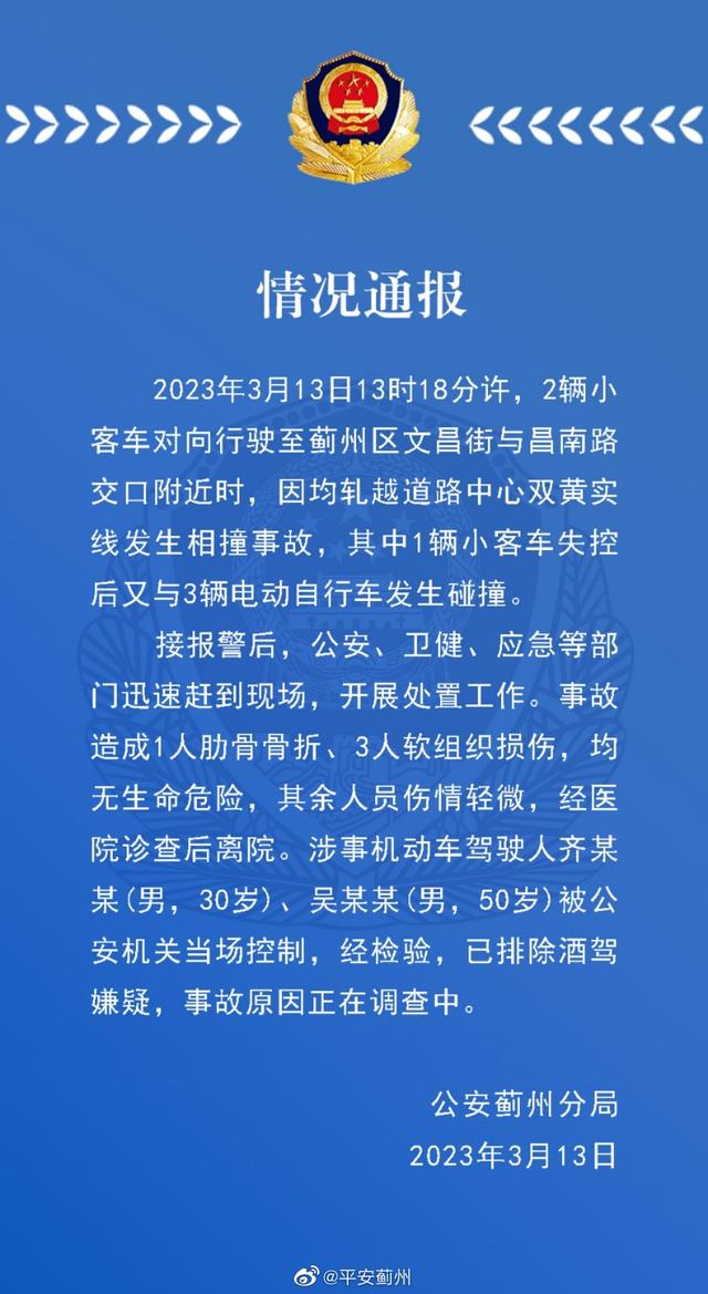 据@平安蓟州 消息,2023年3月13日13时18分许,2辆小客车对向行驶至蓟州区文昌街与昌南路交口附近时,因均轧越道路中心双黄实线发生相撞事故,其中1辆小客车失控后又与3辆电动自行车发生碰撞。